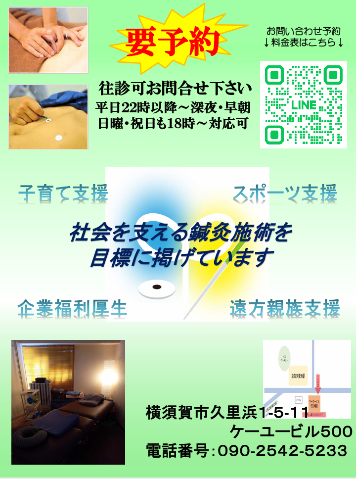 初回限定1500円~3300円引き 治療時間に応じ、割引変動 ※26歳以下の学生は学生証、65歳以上の方は保険証提示で半額!! 保険取扱い鍼灸院です。健康保険取扱いご希望の方はお問合せ下さい。 お支払い時にはPayPay・電子マネー各種・楽天ペイアプリ・メルペイもご利用頂けます。 |